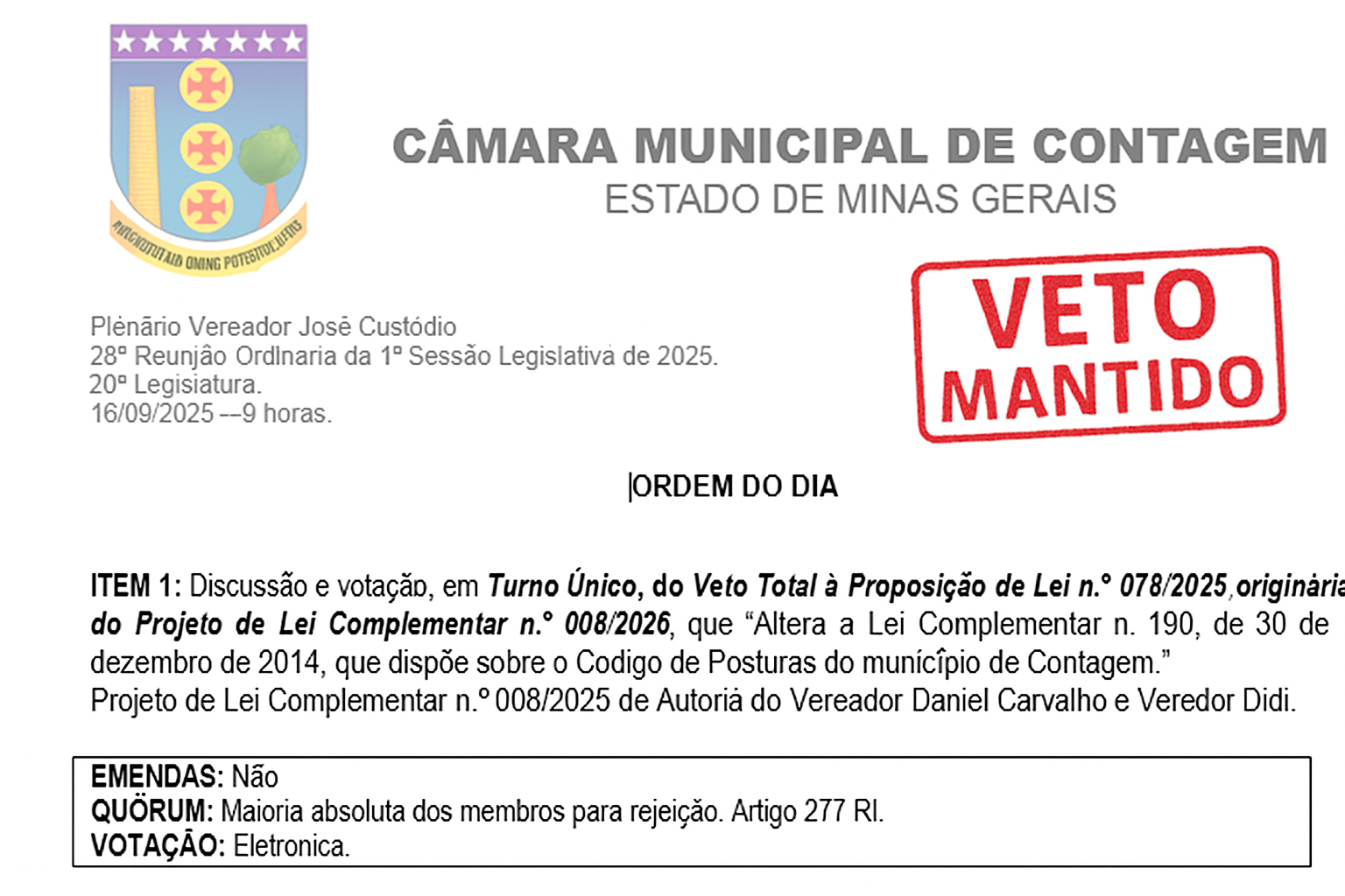 A reunião ordinária da última semana na Câmara Municipal de Contagem foi marcada pela manutenção de vetos do Executivo a quatro projetos de lei (PL) propostos por vereadores e aprovados em junho pelo Legislativo. Com a aprovação dos vetos, as proposições foram arquivadas na Câmara.