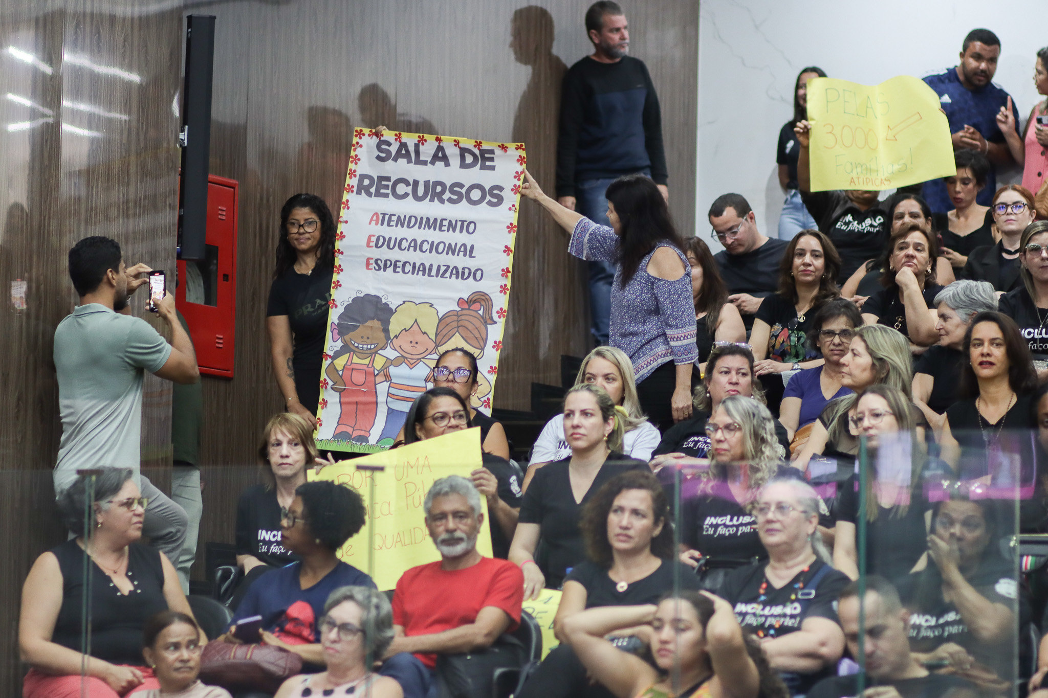 A plenária desta semana na Câmara de Contagem foi marcada pela presença de dezenas de profissionais do Atendimento Educacional Especializado (AEE), serviço de suporte para a educação inclusiva na rede municipal de ensino. O objetivo foi buscar o envolvimento dos vereadores na busca por esclarecimentos e soluções para o impasse com a Administração Municipal, que pretende desligar os servidores efetivos do AEE e substituí-los por profissionais contratados via Processo Seletivo Simplificado (PSS) a partir do ano que vem.
