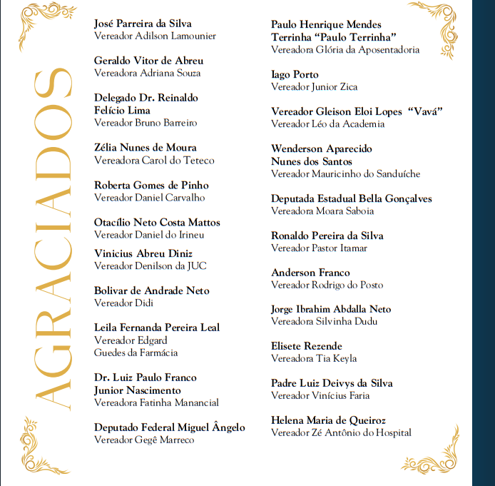 O Legislativo de Contagem realiza, nesta quinta-feira (13/11), às 19 horas, no Plenário Vereador José Custódio, a Solenidade de Outorga dos Títulos...