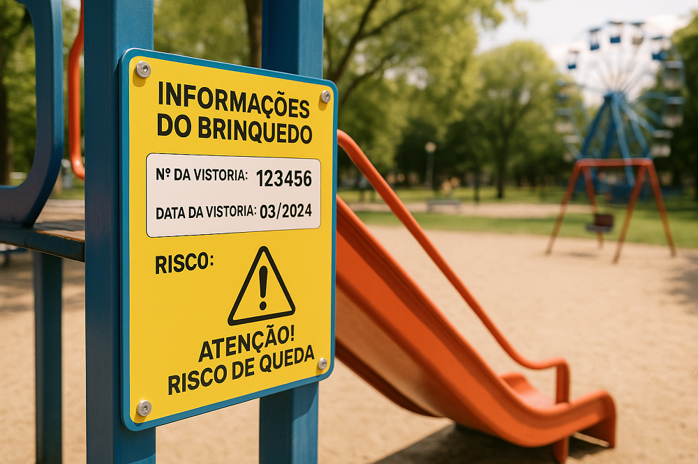 O texto pontua que as placas devem conter dados relacionados à data de manutenção e vistoria técnica, bem como informações relativas aos eventuais riscos inerentes a sua utilização, destacando questões de saúde e citando, como exemplo, a seguinte frase: “Este brinquedo não deve ser utilizado por pessoa hipertensa ou cardíaca”.